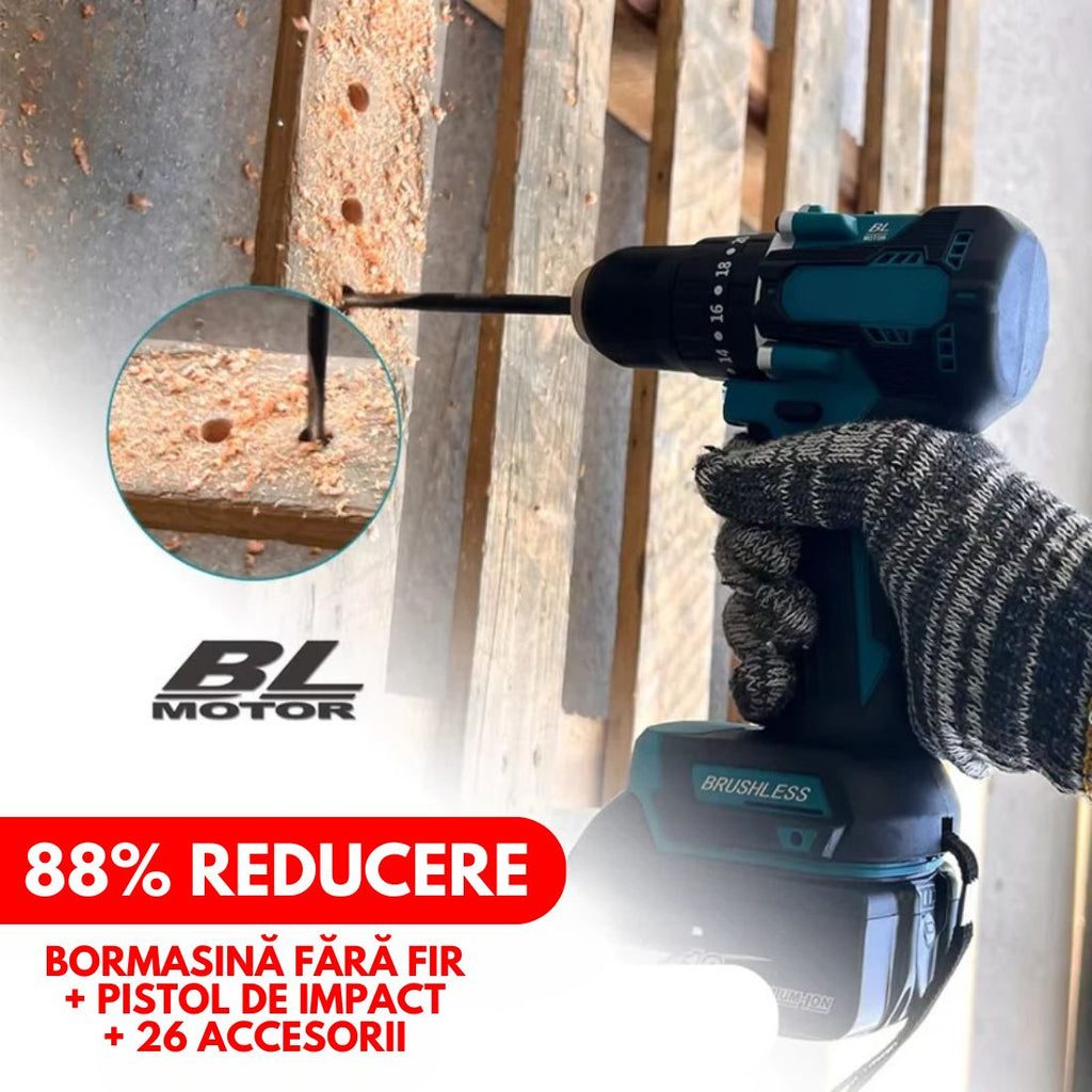 KIT ORIGINAL: BORMASINĂ CU ACUMULATOR + CHEIE DE IMPACT + 26 DE ACCESORII + 2 BATERII